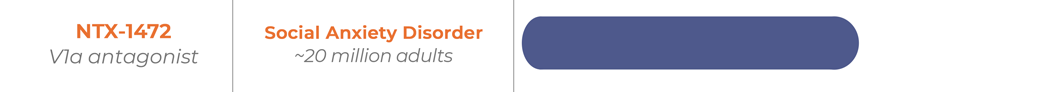 NTX-1472 is a best-in-class, highly selective, brain-penetrant vasopressin 1a (V1a) receptor antagonist in development for SAD. V1a is the receptor for arginine vasopressin (AVP), a neuropeptide that modulates amygdala activation to threatening stimuli and anxious moods. V1a receptors are expressed at high levels in multiple regions of the brain that modulate social behaviors and anxiety, such as the central amygdala, lateral septum, and bed nucleus of the stria terminalis.
