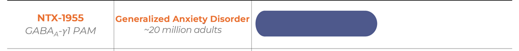 NTX-1955 is a first-in-class GABAA-γ1 positive allosteric modulator (PAM) in development for GAD. GABAA is the major inhibitory neurotransmitter in the brain and positive allosteric modulation of the GABAA receptor is a well-validated approach for managing GAD symptoms. Nonselective GABAA PAMs such as benzodiazepines, while robust anxiolytics, modulate GABAA receptors throughout the entire brain, including in brain regions that lead to cognitive and sedative side effects. In contrast, NTX-1955 is designed to selectively engage GABAergic transmission in the amygdala, which is at center of the brain’s regulation of anxiety and highly enriched for the GABAA-γ1 receptor subunit, thereby sparing brain networks associated with the safety liabilities of benzodiazepines. .