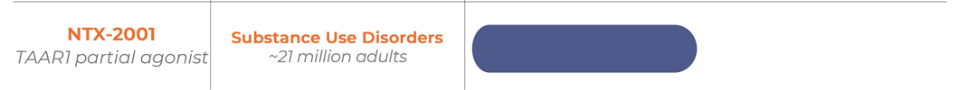 Robust preclinical and human genetic data support TAAR1 agonism as a promising therapeutic approach for treating SUDs. NTX-2001 has completed Phase 1 Single Ascending Dose, Multiple Ascending Dose, and drug-drug interaction studies and was found to be safe and well tolerated.